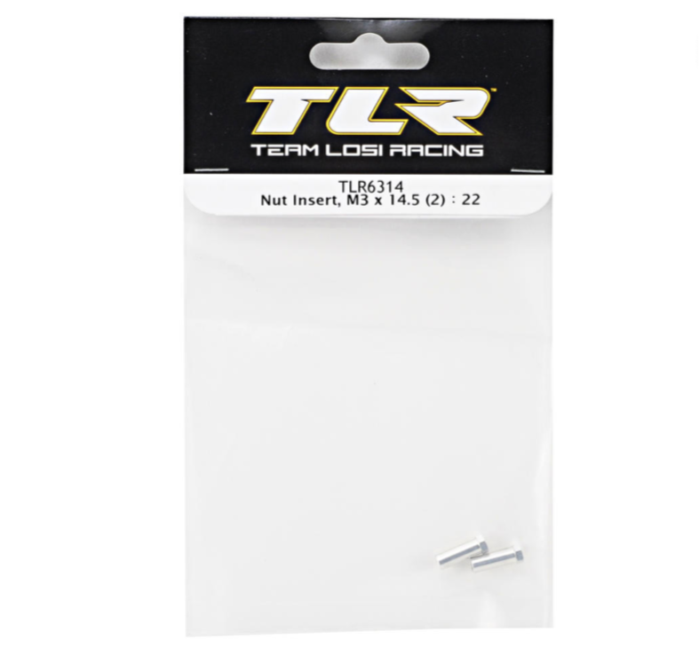This is a set of two replacement Team Losi Racing 3x14.5mm Nut Inserts, and are intended for use with the Team Losi Racing 22 and 22T 1/10 scale vehicles.