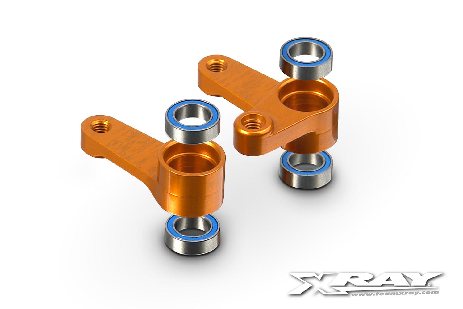 Set of 2 alu arms (L+R) for dual servo saver. Ultra-strong construction provides long life and durability in even the most extreme racing conditions. CNC-machined from premium Swiss 7075 T6 aluminum for superior strength and reliability, this is a direct replacement for the composite servo saver arms. Includes ball-bearings. Orange anodized.