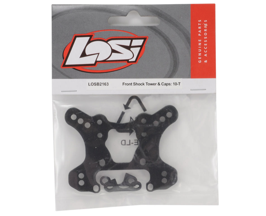 This is a replacement Losi Front Shock Tower and Caps, and is intended for use with the Losi Ten-T truck. This front shock tower attaches to the front bulkhead and secures the upper portion of the shock at the shock cap. This shock tower features three optional shock mount positions to alter the shock geometry by moving the shocks either in or out on the tower, as well as two camber link locations to adjust the front roll center.