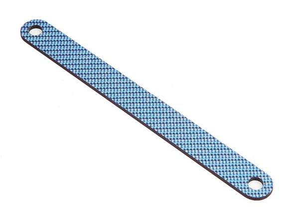 CNC-machined graphite battery brace (blue) for securing 5-cell or 6-cell pack in XRAY M18. Fits on the stock M18 chassis and the optional graphite chassis.