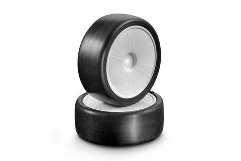 Set of 4 tires includes new inserts with improved quality and optimized hardness and thickness. Tires are precision pre-glued on HUDY touring car wheels moulded from our own composite mixture to ensure true fit, vibration-free running as well as proper hardness matched to the tire compound. The new wheel material improves durability.