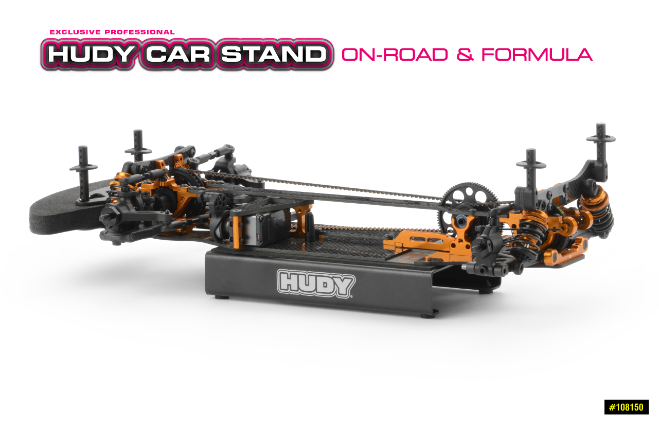 Redesigned and improved HUDY stylish touring car stand for 1/10 electric and nitro touring cars as well any 1/12 and formula. Features new lower and more compact rubber feet that make the stand more stable.