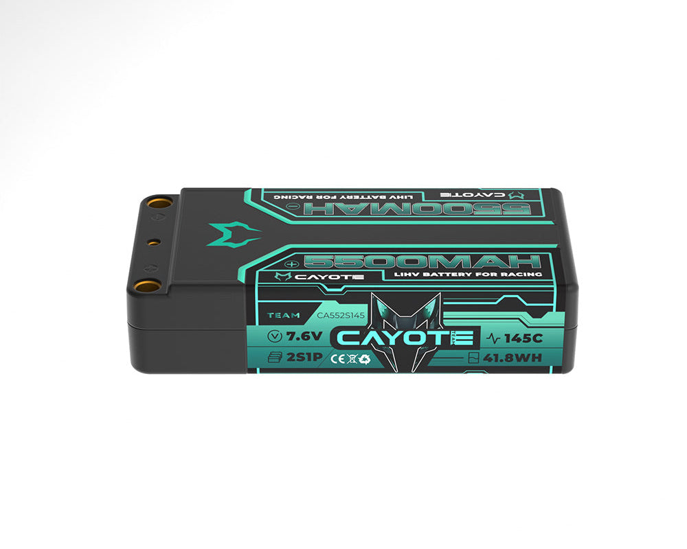 CAYOTE Racing 2S Shorty LiPo battery with a capacity of 5500mAh at 7.6V and 145C.
