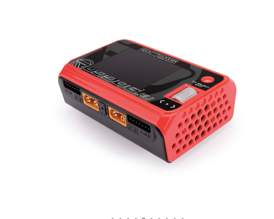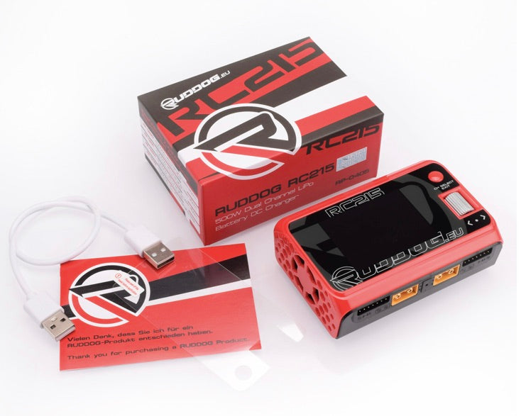 The RUDDOG RC215 500W Dual Channel LiPo Battery DC Charger is a compact and powerful device that allows to charge up to two battery packs simultaneously with up to 15A of charge current. When used in the combined ASYNC mode, a maximum of 25A of charge current is possible. The DC charger can be used with 1S to 6S LiHV/LiPo, 1 to 16 cell NiMH or 1S to 10S batteries and it works with 7VDC to 28VDC input. A powerful discharge function allows for up to 3A of discharge current or 15A when used in the Recycle mode. A 320x240 pixel 2.4 inch LC display allows to monitor the charger’s and batteries’ vital signs with the compact 98x69x35mm dimensions making it easy to store and transport the charger for weekly racing or traveling abroad.
