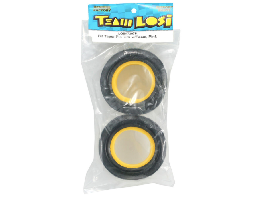 This is a set of two Losi Taper Pin Front Buggy Tires in Pink rubber compound with included foam inserts. Proven on hard-packed and “blue groove” type track surfaces, the taper bin buggy tire design is available in Losi’s exclusive “pink” compound, perfect for indoor racing. Tires include firm foam liners for proper support.