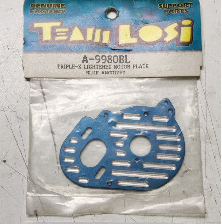 This is a Team Losi Part with nummer A-9980BL " XXX Lightened Motor Plate Anodized Bleu "